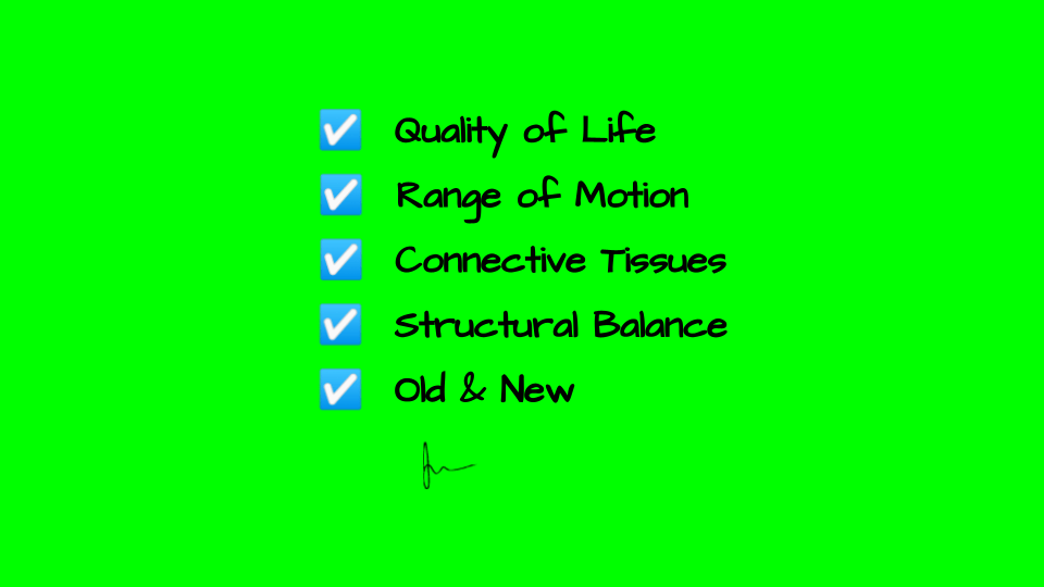 > Range of Motion < Full range, partial, and everything in between. Would it be wise to be strong in one particular part of the range but not others? Also, moving our joints through a full range brings synovial fluid in, signaling repair and restore. As most of us can acknowledge with age, our joints work under an approach of ‘use it or lose it’.